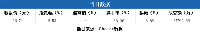 蔚蓝生物当日报收26.74元,涨跌幅为6.53%,换手率36.06%,振幅6.89%,成交额3.78亿元。
