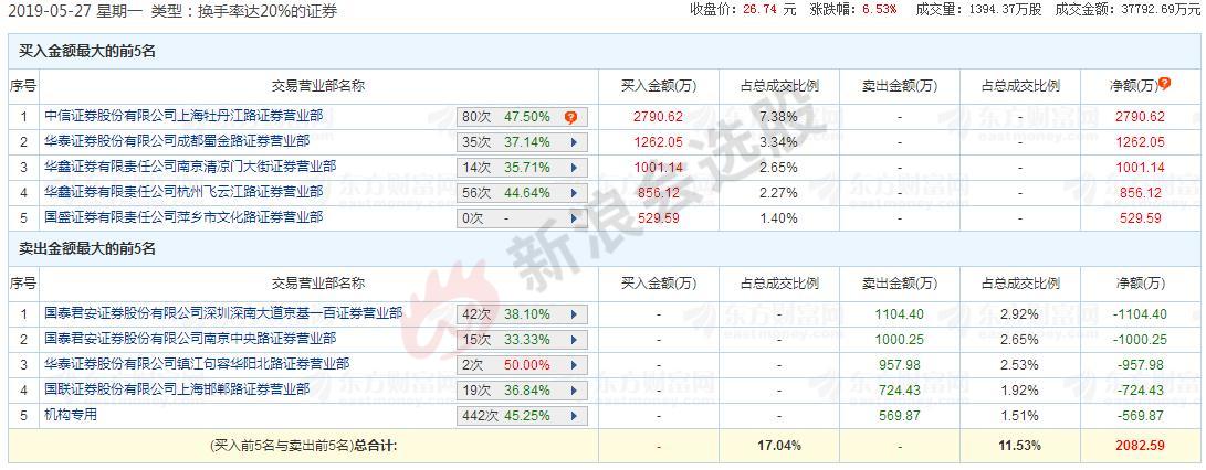 上交所2019年5月27日交易公开信息显示,蔚蓝生物因属于当日换手率达到20%的证券而登上龙虎榜。