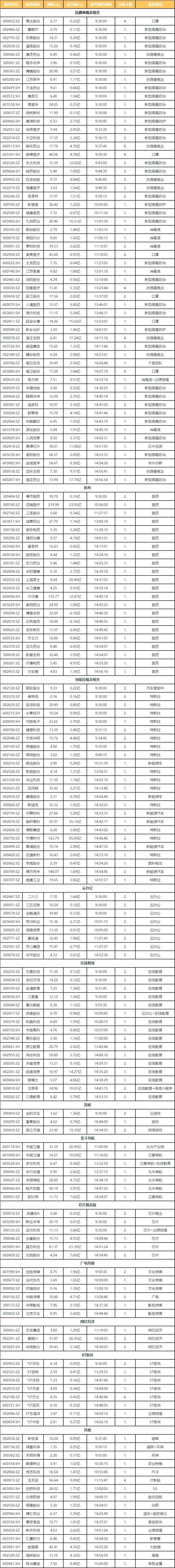 盘面上看,疫情持续推高云办公需求,相关概念股连续多日走强,会畅通讯(300578)、二六三(002467)、三五互联(300051)等均一字涨停;医药股全线走强,口罩、化学制药、中药等概念股纷纷大涨,泰达股份(000652)、振德医疗(603301)、欣龙控股(000955)等封板;特斯拉午后维持涨停潮,奥特佳(002239)、常铝股份(002160)、模塑科技(000700)等十余股涨停;银行股早盘冲高,午后持续回落,宁波银行一度跌近4%。