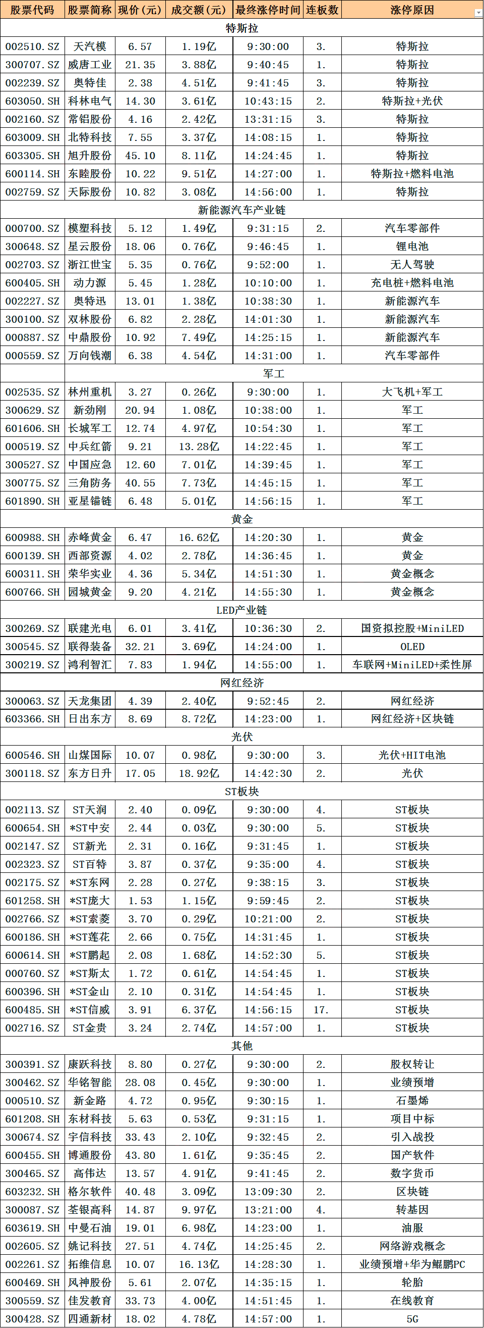 涨停复盘:新能源车板块多股涨停 军工股强势崛起