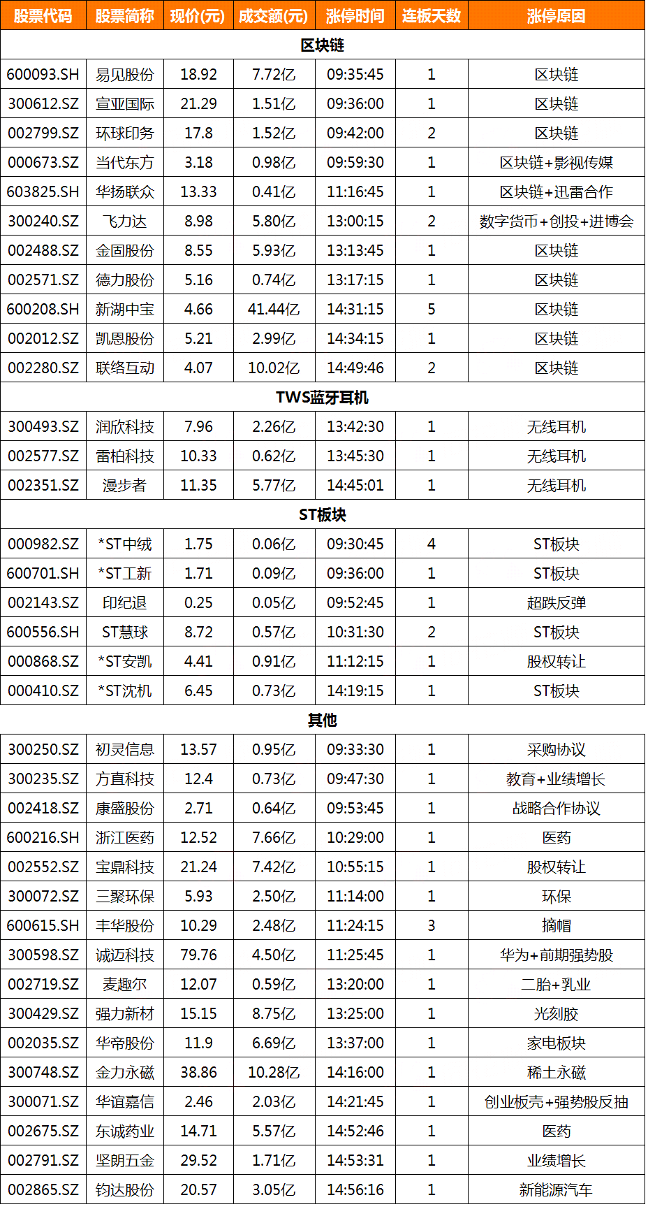 区块链:易见股份,新的高位反包板,区块链中军,有望继续连板。新湖中宝,放量涨停,量能太大了,明天难有资金接力。环球印务卡位飞力达,低位补涨,明天有望紧急三连板。金固股份,人气反包股,有望一进二。