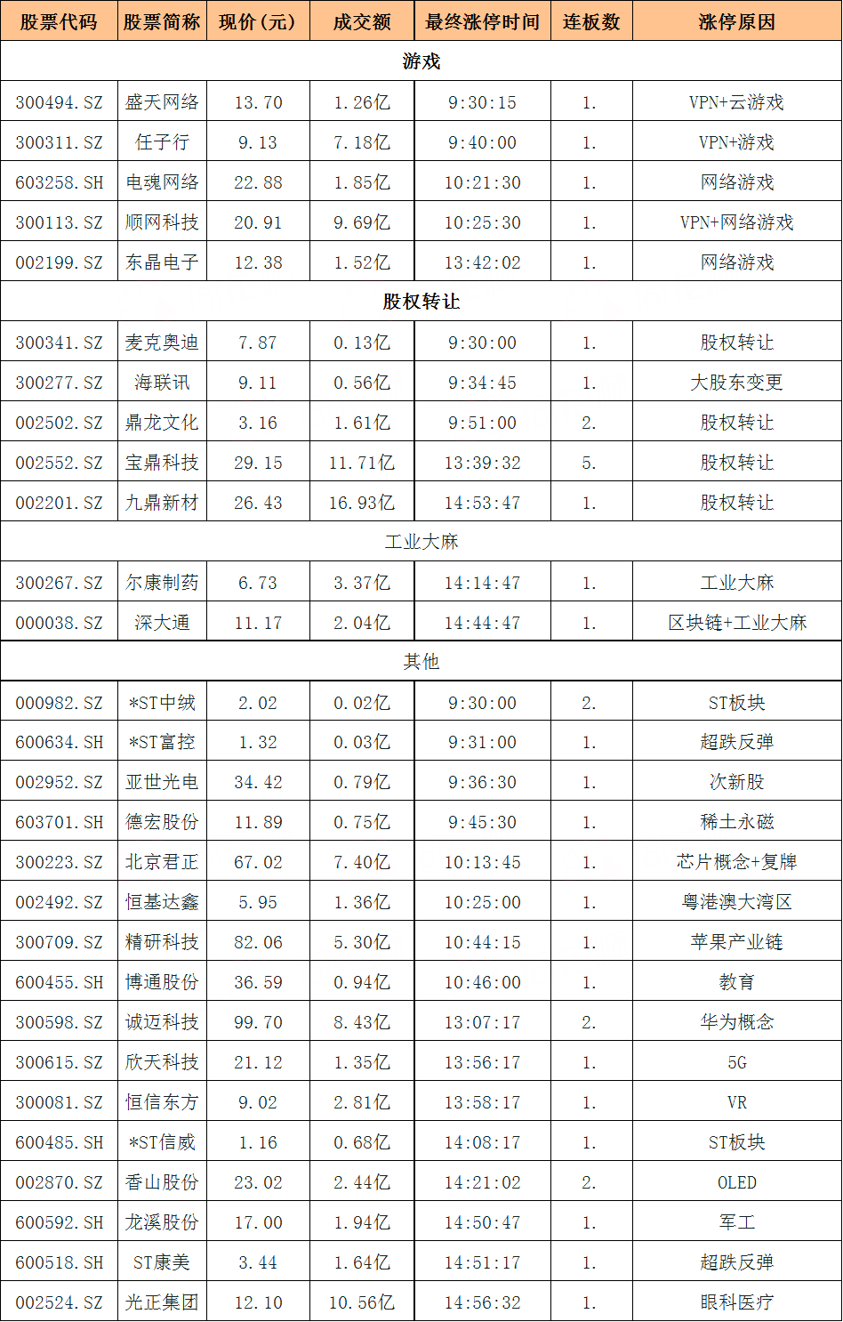 涨停复盘:网游概念崛起 股权变更概念依旧活跃