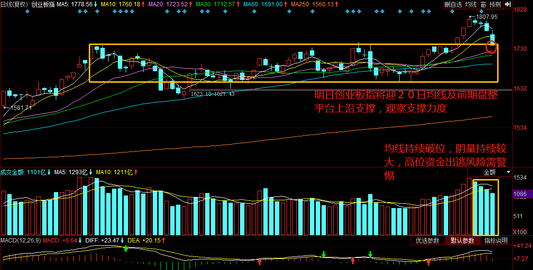 尽管市场上依旧充斥着众多券商、媒体的牛市论,但作为市场上真金白银参与者的我们,务必要客观全面地看待市场趋势。明日市场将迎来20日均线、前期盘整平台上沿的支撑,开盘可能会惯性下跌,但明日指数需走出较为强势的止跌回升K线,持续光头阴线或弱反弹均不容乐观,需减仓控制风险。
