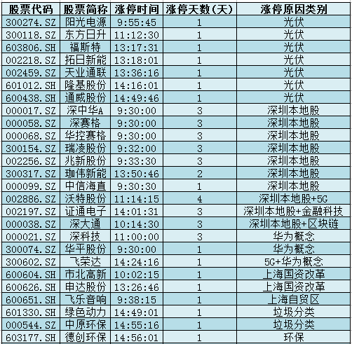 2.深圳本地股:中央支持深圳建设先行示范区,深科技(3板)、深赛格(3板)、华控赛格(3板)、深中华A(3板)、兆新股份(3板)等个股涨停。