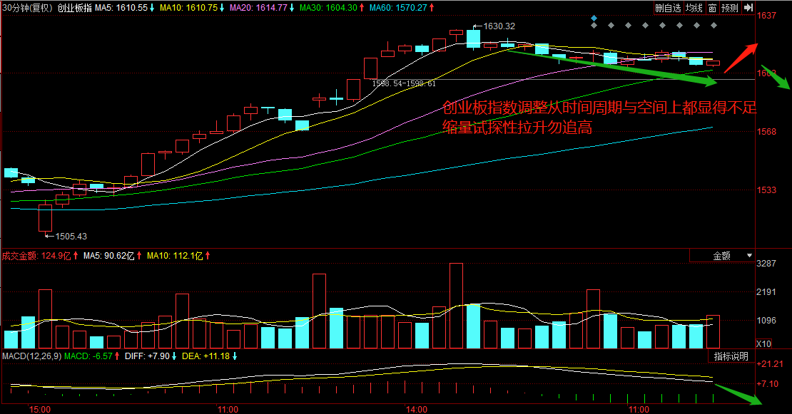 对于大盘走势,昨天的明确观点是上攻不可一蹴而就,当前行情下维持震荡判断的观点。今日回调过程中成交量进一步缩减,从整体看,指数依然处于良性调整中。创业板指由于涨幅最大,且前期高位震荡平台抛压过大,连续两日的阴棒量能显示市场分歧依旧较大。从创业板短线30分钟的K线及MACD指标走势看,调整的时间与空间仍显不足。