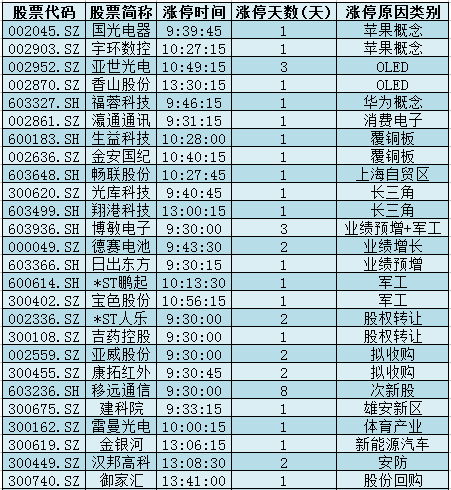 1.苹果产业链+消费电子:苹果将于今年秋季推出三款iPhone 11机型+5G智能手机开始商用,国光电器、宇环数控、亚世光电、香山股份、福蓉科技、瀛通通讯涨停。