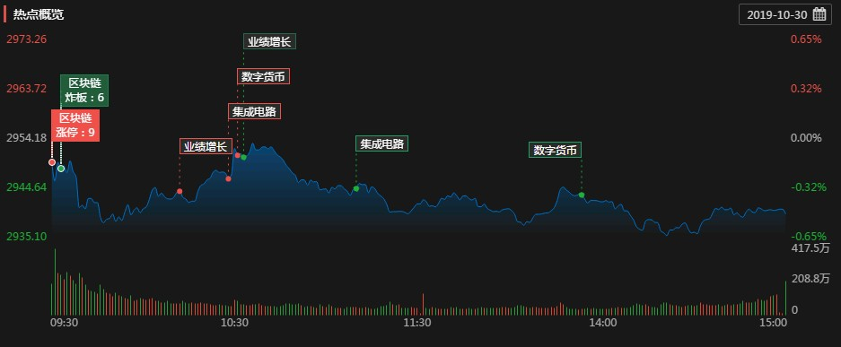 盘面上看,区块链概念股炒作降温,迎来明显分化,万方发展(000638)、三力士(002224)、日出东方(603366)、红相股份(300427)等多股相继跌停,数字认证(300579)、聚龙股份(300202)等个股午后反抽;养殖概念早盘冲高回落,天山生物(300313)等一度跌停,尾盘水产类概念反弹拉升,国联水产(300094)触板;二胎、乳业等概念股今日表现活跃,康芝药业(300086)、西部牧业(300106)先后涨停;白酒概念拉升,金徽酒(603919)冲击涨停。
