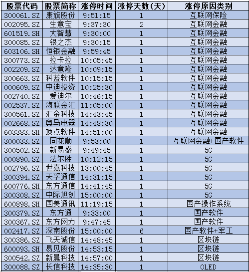 从板块上看,受国常会力挺降准降息消息影响,大金融板块全面上涨,证券、保险板块早盘一度上涨超5%,互联网金融个股上演涨停潮;科技股同样延续强势表现,消费电子、国产软件板块涨超2%,区块链概念尾盘多只个股直线封板。