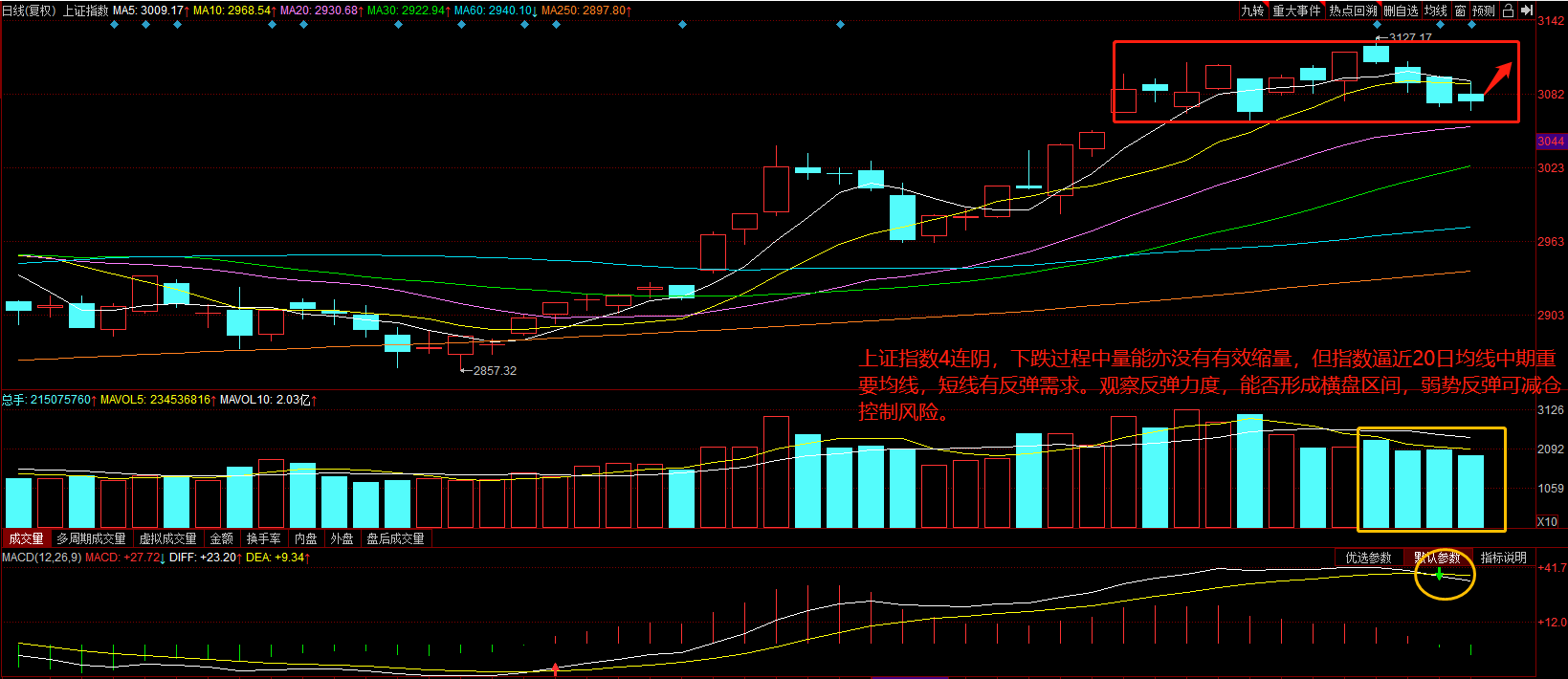 后市策略:上证指数4连阴,量能上也没有随不断的调整而缩量,短期形态不是特别好。但从中期趋势看,当前的调整并未走向恶性,当前低点接近前期调整低点与20日中期重要均线的双重支撑,可以说反弹一触即发。我们需要观察的是反弹的力度与量价配合情况,如果反弹强势,有望盘整后继续上攻;如果弱势反弹,则逢高需降低仓位控制风险。