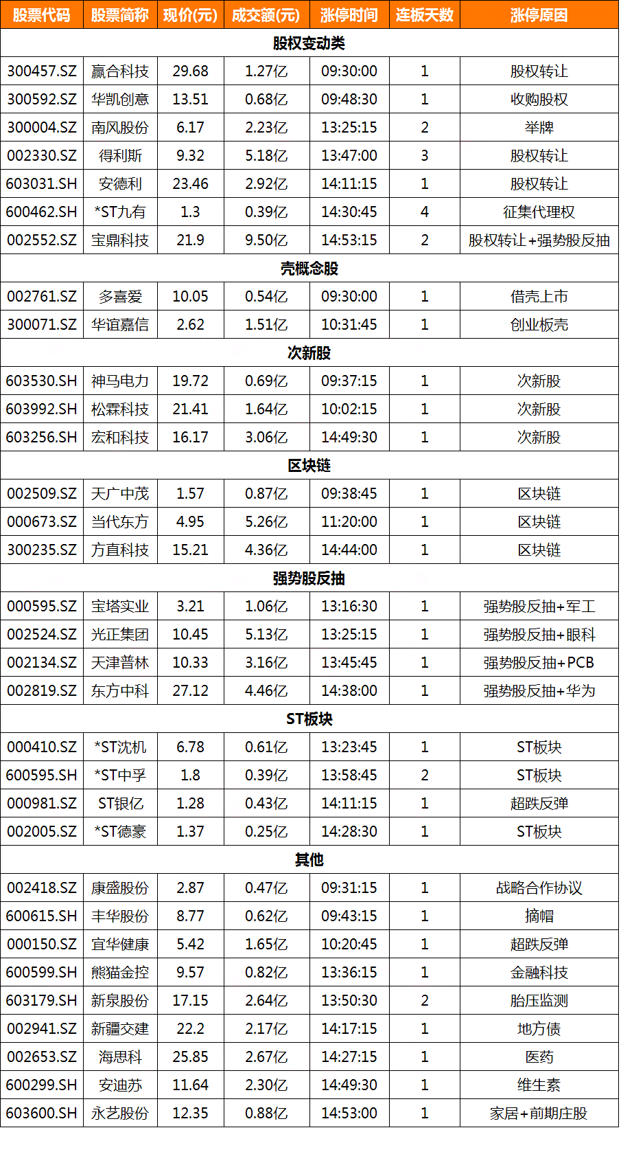 盘面上看,康恩贝(600572)旗下子公司取得工业大麻花叶加工许可证,康恩贝冲击涨停,带动工业大麻板块一度活跃,临近尾盘有所回落;刘鹤主持召开国务院国有企业改革领导小组第三次会议,国企改革板块异动拉升,瑞泰科技(002066)冲板;军工概念股午后有所上涨,宝塔实业(000595)直线涨停封板;光刻胶、5G等科技股拉升,胜利精密(002426)触板,沪电股份(002463)冲击涨停;近期大热的无线耳机概念早盘大幅回调,午后有所回暖,惠威科技(002888)一度涨停;猪肉概念股反弹拉升,得利斯(002330)涨停。