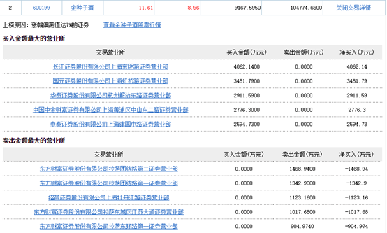 金种子酒8天4板, 6连阳,股性活跃,近月涨逾70%。值得注意的是,该股近6个月的净利润为负,完全是炒题材忽略业绩。盘后龙虎榜显示,买五席位有包括章盟主在内的3个一线游资,情绪票。卖五席位大部分是东方财富证券拉萨团结路营业部,游资基本把散户洗出去了。