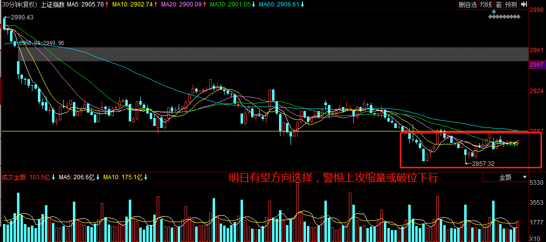 后市策略:显然年线处的多空争夺已持续数日,好的现象是近几日大盘并未有效创新低,均是阳线夯实底部。今日指数收盘略低于5日均线,明天将迎来方向选择。银行板块近期表现弱势,仍有破位风险,短线依旧紧盯30分钟短周期,上攻缩量(假突破嫌疑)或破位下行均需警惕。