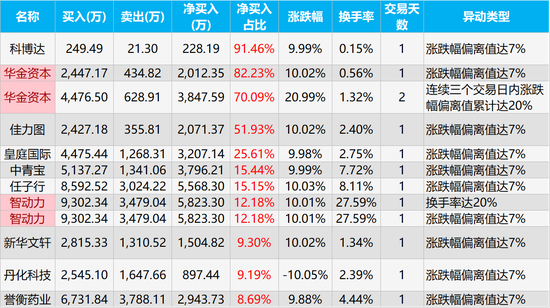 龙虎榜净买入占比最高的三只股票是科博达、华金资本、华金资本,净买入金额为228.19万元、2012.35万元、3847.59万元,净买入占比分别为91.46%、82.23%、70.09%。