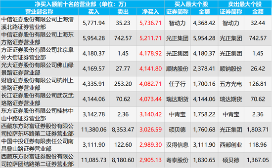 龙虎榜净买入金额前三的营业部是中信证券(22.560, -0.13, -0.57%)上海漕溪北路证券营业部、中信证券上海东方路证券营业部、方正证券北京阜外大街证券营业部,净买入金额分别为5736.71万元、5211.71万元、4178.92万元,买入金额最大的个股分别是智动力(20.110, 1.83,10.01%)、光正集团(12.070, -1.34, -9.99%)、光正集团,所对应的买入金额分别为4368.42万元、5954.28万元、4180.37万元。