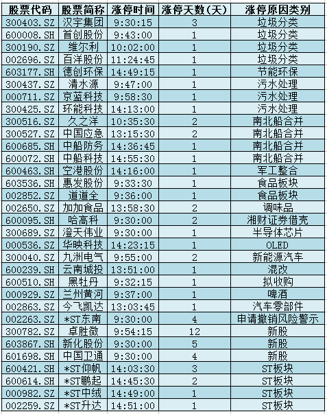 1.垃圾分类+污水处理:上海执行“最严垃圾分类”+国常会要求提高农村饮水安全水平,汉宇集团、首创股份、维尔利、百洋股份、清水源等个股涨停。