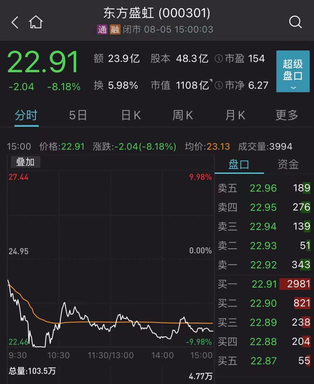 截至收盘,东方盛虹下跌8.18%,盘中一度跌停,全天成交额为23.9亿元,总市值为1108亿元。Wind数据显示,在跌停价的22.46元/股,东方盛虹成交了8.2万手,合计成交额为1.84亿元,即意味着1.84亿元资金抄底东方盛虹。