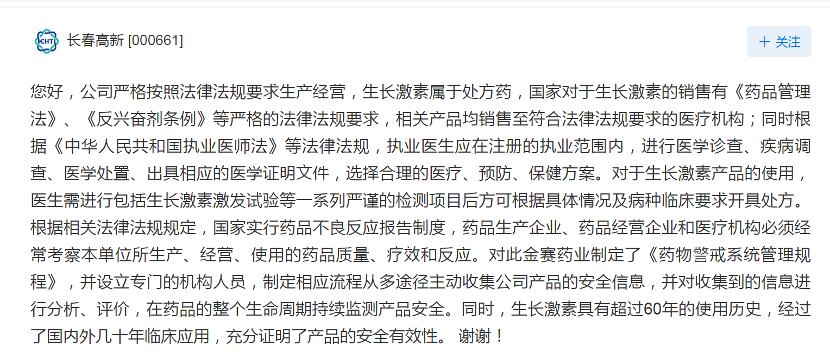 今日,长春高新在互动平台上表示,公司严格按照法律法规要求生产经营,生长激素属于处方药,国家对于生长激素的销售有《药品管理法》《反兴奋剂条例》等严格的法律法规要求,相关产品均销售至符合法律法规要求的医疗机构。