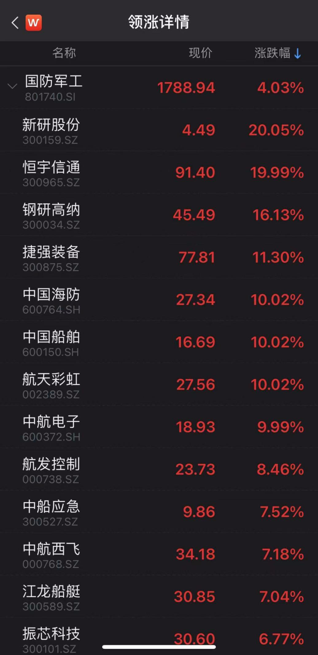 逆市领涨的国防军工板块赚钱效应极佳,上涨个股数接近9成,且板块内多数个股从分时图来看均持续拉升。新研股份、恒宇信通上演“20cm”涨停,航天彩虹、中国海防涨停。