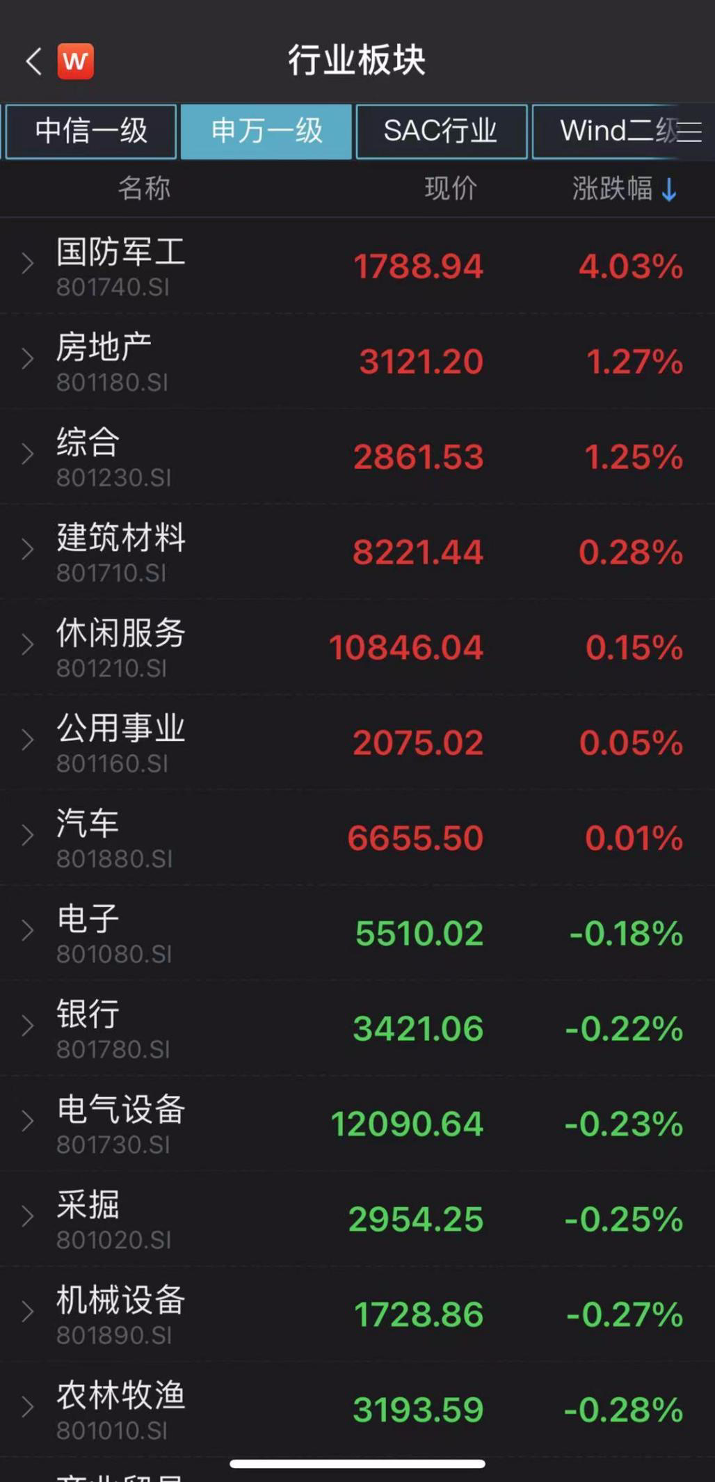 行业板块方面,申万一级28个行业中,国防军工、房地产、综合行业涨幅居前,分别上涨4.03%、1.27%、1.25%;计算机、传媒、有色金属行业跌幅居前,分别下跌2.33%、2.23%、1.45%。