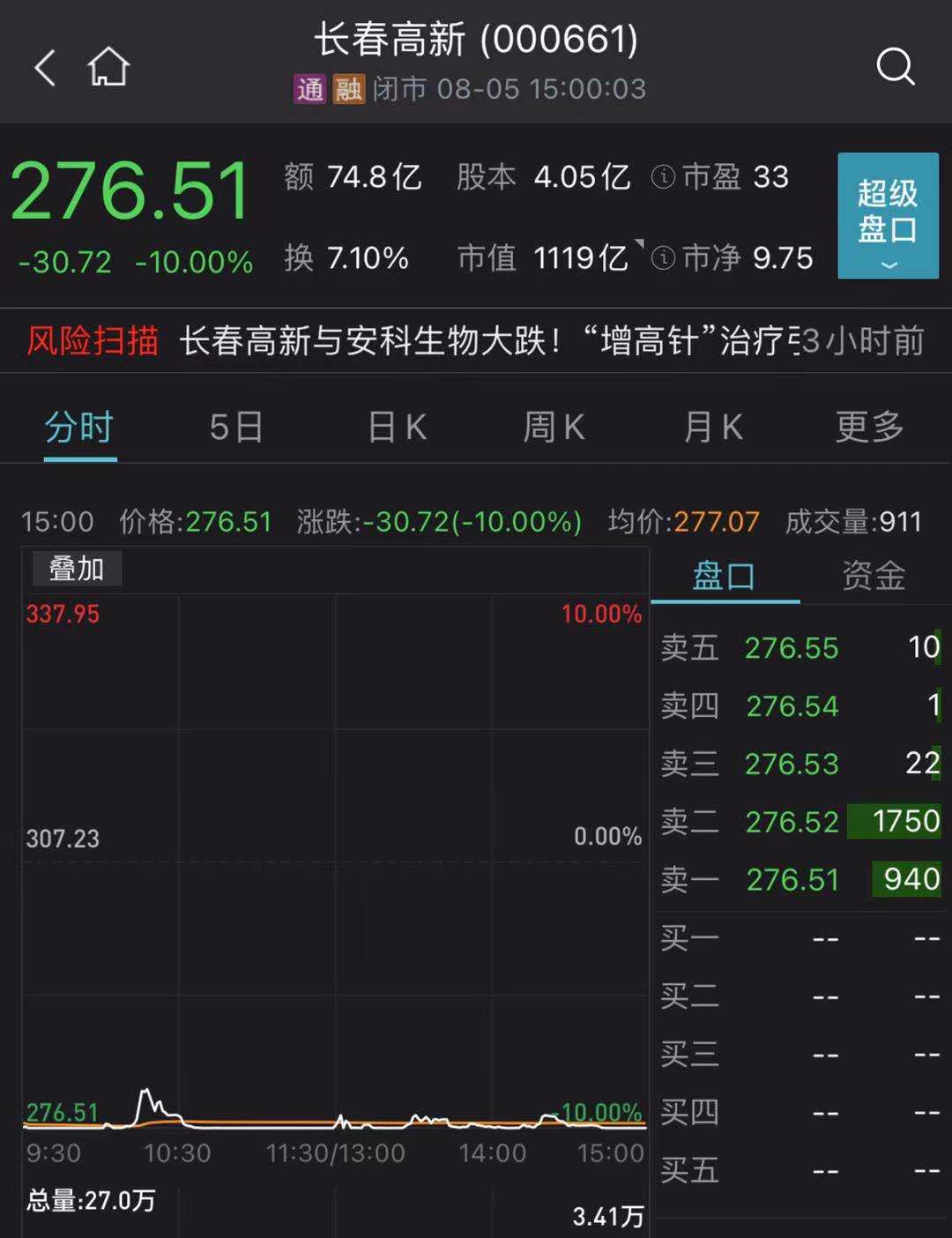 8月5日,A股市场震荡调整,近3000股下跌,千亿市值股票长春高新跌停,军工板块逆市大涨。