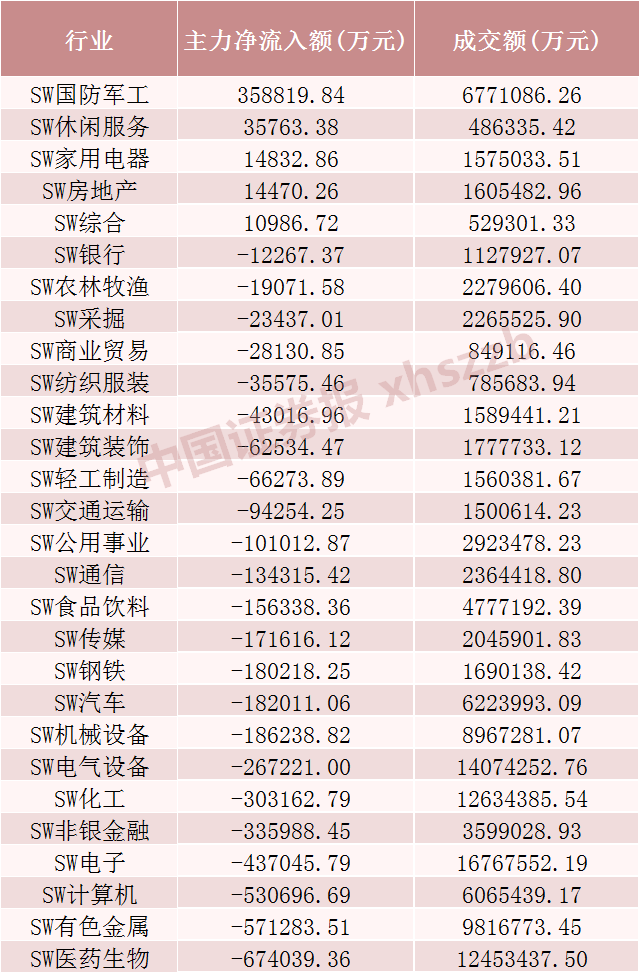 从行业主力资金流向情况来看,Wind数据显示,今日申万一级28个行业中仅有5个行业出现主力资金净流入情况,国防军工、休闲服务、家用电器行业主力资金净流入金额居前,分别净流入35.88亿元、3.58亿元、1.48亿元。在出现主力资金净流出的23个行业中,医药生物、有色金属、计算机行业资金净流出金额居前,分别净流出67.40亿元、57.13亿元、53.07亿元。