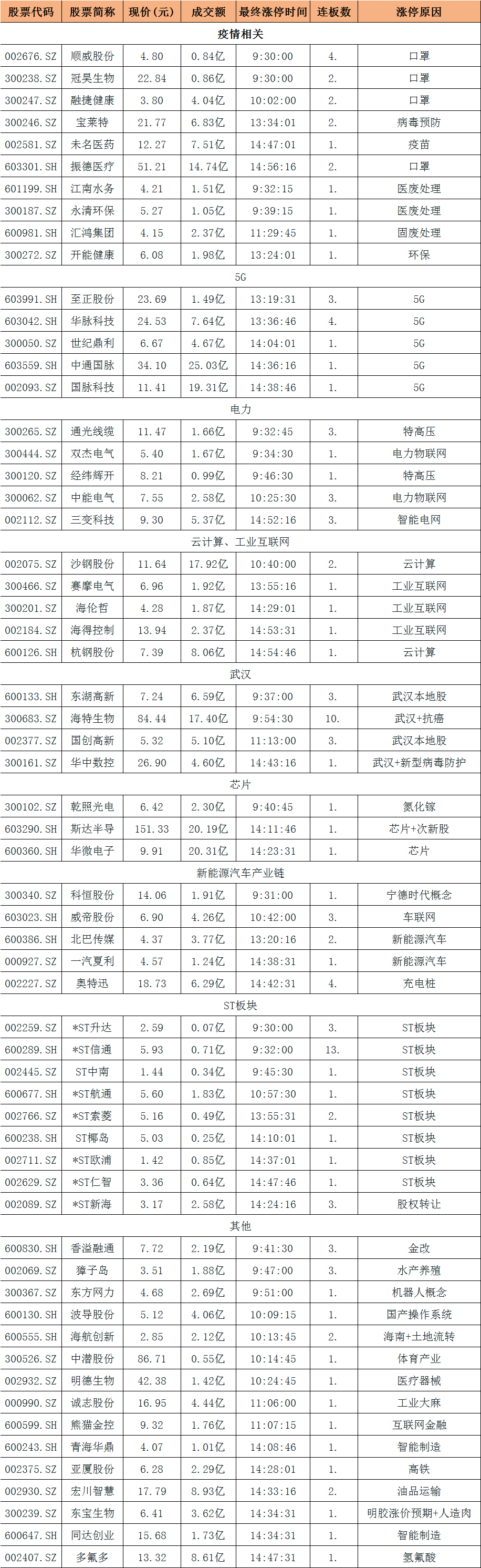 从盘面上看,医疗废物处理版块涨幅居前,午后雪浪环境、润邦股份、侨银环保、启迪环境等个股大幅回落,仅江南水务封住涨停板;半导体及元件板块受市场整体环境影响,午后转弱,斯达半导、华微电子涨停,其余个股午后小幅回落,阿石创、太极实业涨幅超5%;口罩板块分化严重,融捷股份、汇鸿集团、冠昊生物、振德医疗涨停,搜于特、国恩股份跌停;中汽协建议出台汽车下乡促进消费政策,汽车股临近收盘拉升,一汽夏利拉升封板,江淮汽车、东风汽车、一汽轿车等快速跟涨。5G板块尾盘异动拉升,中通国脉涨停,大富科技、烽火通信、东土科技、金信诺等跟涨。