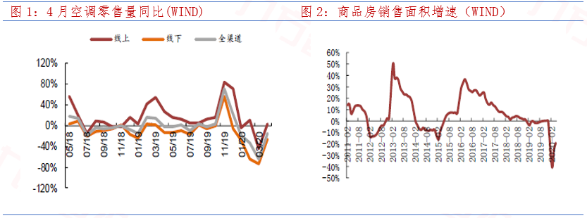 其次,产品销量方面,(1)空调:1-4月空调出货同比-25%,其中内销同比-45%,出口同比-0.3%但面临滞后冲击;4月零售量/额同比(-16%/-27%)已相较Q1明显改善,5月线下-5%/-14%,线上+17%/-2%进一步复苏,线下价格竞争趋于缓解;空调渠道库存约3000万套,库存水位4个月左右;4月内销方面仍面临终端零售负增长+库存高位,在新旧能效更替之际经销商提货意愿偏向谨慎,4月出口表现较好主因前期订单集中交付,疫情冲击或在后续几个月逐步显现,预计内销将在一段时间之后恢复。