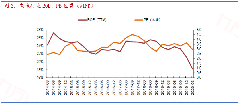 从PB-ROE视角来看的话:ROE(TTM)大概率已在底部,PB落至均值以下。PB-ROE策略寻找ROE向上拐点将现+PB历史低位的行业作为最佳配置方向。仍然选取17个家电股票作为研究对象,其整体ROE(TTM)自18年中报见顶后处于下降通道,20年一季报ROE(TTM)为18.2%,环比大幅下挫,通过拆分可得权益乘数和净利率明显下滑,周转率基本持平,核心家电的ROE(TTM)大概率会迎来见底回升。PB在ROE的周期运行中有两个特点:一是ROE = PB/PE,因此ROE上行周期中PB比PE弹性更大;二是PB代表投资者对企业盈利能力的预期,所以通常领先ROE波动1-2个季度,20 年一季报17只家电股的整体PB为3.0,回归2014年至今均值(3.3)之下。这一轮基本面的下行周期始于2017年中,从各自的高点算起ROE(TTM)回撤比例为29%,PB的下行幅度为35%,两者较为匹配,已经接近于调整的极限。