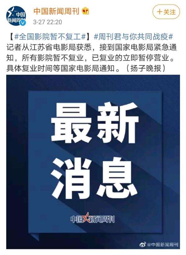 3月27日晚,国家电影局紧急通知,所有影院暂不复业,已复业的立即暂停营业。据不完全统计,截至27晚8时左右,已有广东、上海、江苏、山东等省的影院收到关门的消息,具体复业时间等国家电影局通知。