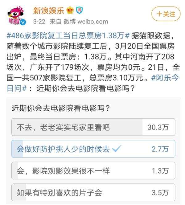 另据新浪娱乐调查显示,影院复工后选择“不去看”的的人数是选择“去看”人数的几何倍数。