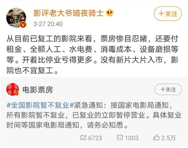 知名影评人表示,从目前已经复工的影院来看,票房低迷,覆盖不了人工水电,消杀防疫以及设备磨损等成本,没有新片大片的输入,影院暂时不宜复工。