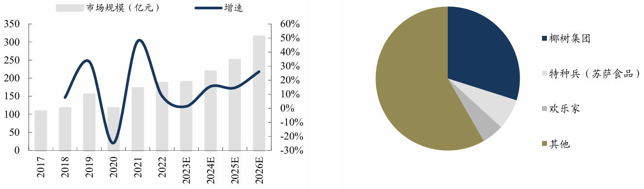 图:2017-2026年中国椰子水加工市场规模及增速 图:2022年椰子水品牌市占率 |