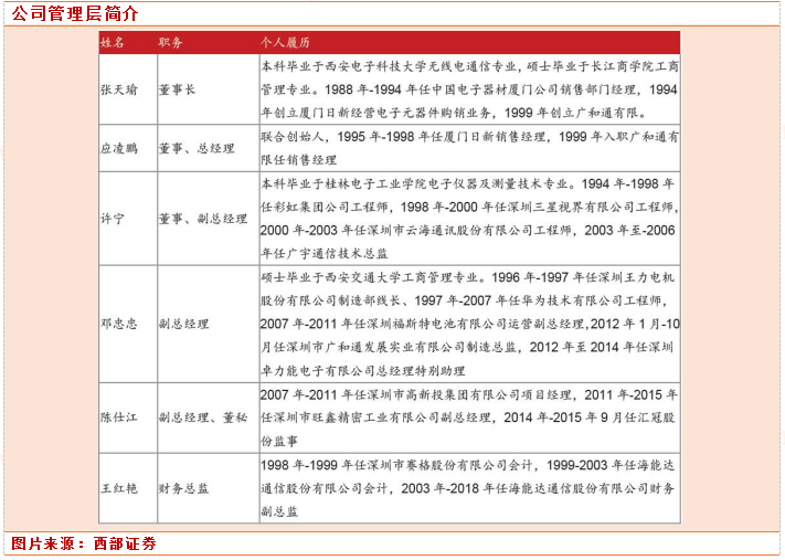 董事长张天瑜毕业于西安电子科技大学无线电通信专业,曾担任销售部经理。联合创始人应凌鹏曾担任厦门日新销售经理,自加入公司以来一直负责销售业务。董事、副总经理许宁担任工程技术人员十余年,副总经理邓忠忠曾任华为技术工程师,福斯特电池运营副总经理。