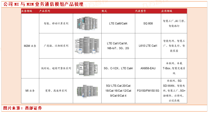 公司主要从事无线通信模块及其应用行业通信解决方案的设计、研发与销售服务。拥有M2M(Machine to Machine)及物联网通信模组研发经验20 余年,自主研发设计5G/4G/LTE Cat 1/3G/2G/NB-IoT/LTE Cat M/安卓智能/车规级无线通信模组。其产品广泛应用于移动支付、移动互联网、车联网、智能电网、安防监控等领域。