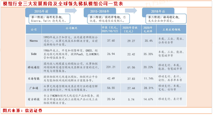1)海外先导期:海外发达国家如加拿大、美国、英国、德国等在物联网发展上率先起步,因此较早催生了模组行业的导入与发展,并且由于发达国家存在通信标准定制的较高话语权,模组在海外市场享有发展便利性,因此模组行业发展早期以海外企业为主,几大海外模组龙头企业均诞生于该时期,如Telit 诞生于1986 年、Sierra Wireless 成立于1993 年等;