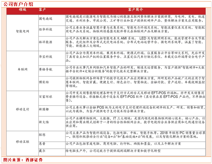 模组下游应用涉及M2M与MI。M2M 模组主要应用于移动支付、智能电网、车联网、安防监控等领域,MI 模组应用于平板电脑、二合一电脑、笔记本电脑、电子书等消费电子类产品。