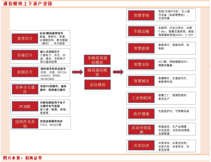 通信模组在物联网产业链中处于网络层,用以集成到各类物联网和移动互联网设备,实现数据的互联互通和智能化。