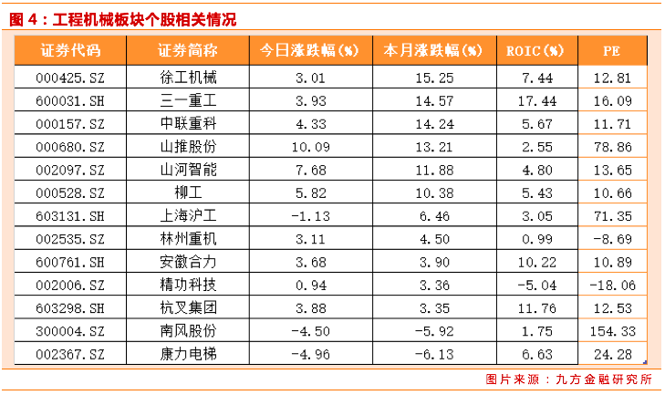 今天重点梳理工程机械板块,从市场表现上来看,工程机械板块不仅今天表现亮眼,四月份以来涨幅更是可圈可点,徐工机械本月涨超15%,三一重工、中联重科、山推股份等涨幅均超过10%。
