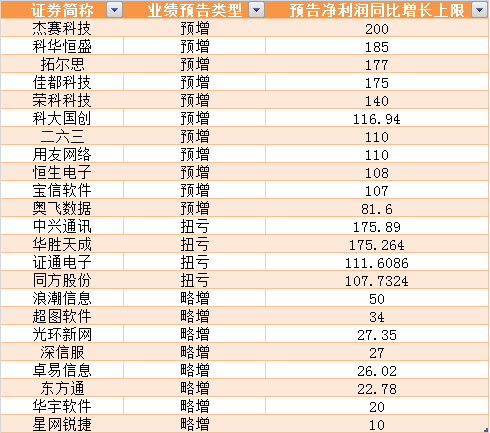 2019年业绩预告显示,按预告净利润同比增长上限看,杰赛科技、科华恒盛、拓尔思、佳都科技、荣科科技 、科大国创、二六三、用友网络、恒生电子、宝信软件预增幅度超过100%。另有多家公告预告扭亏,包括中兴通讯、华胜天成、证通电子、同方股份。