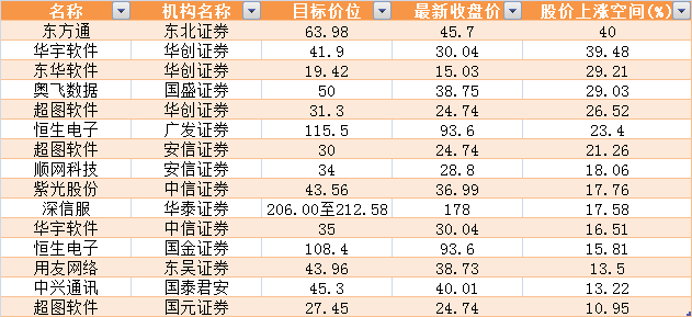 从研究报告给出的股价上涨空间排行看,今年以来出具的研究报告中,东方通和华宇软件距离目标股价有近40%的上涨空间,东华软件、奥飞数据目标涨幅空间近30%,超图软件、恒生电子、超图软件目标涨幅空间超20%。