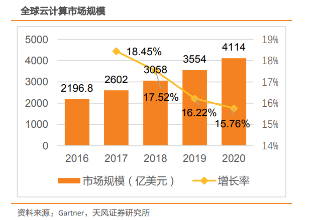 根据Gartner预测,到2022年,全球云计算市场规模将达到2700亿美元,预计未来几年增长维持在20%左右。我国云市场增速高于全球,2018年我国整体云计算市场规模达962.8亿元,增速39.2%。