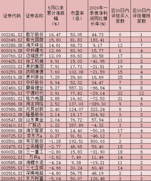 值得一提的是,北向资金价值投资的理念往往能在市场中结出硕果。5月份以来截至5月26日,北上资金净买入的28只个股中,共有20只个股期间累计实现上涨,占比71.43%。其中,歌尔股份、紫光国微、海天味业、中科曙光、迈瑞医疗等5只个股期间累计涨幅均超12%。此外,贵州茅台股价更是迭创新高。
