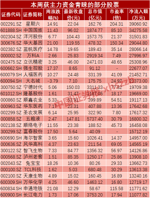 网红概念股星期六排名榜首,周内吸金3.91亿元;中国国旅居次,同期净流入额为3.43亿元;洋河股份排名第三,同期净流入额为3.15亿元;往后依次为华大基因、蓝帆医疗、万科A等7股,净流入额均在2亿元以上。