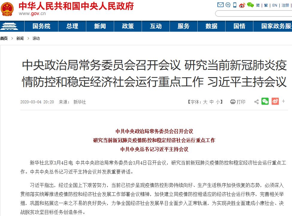 据央视新闻,中共中央政治局常务委员会3月4日召开会议,研究当前新冠肺炎疫情防控和稳定经济社会运行重点工作。中共中央总书记习近平主持会议并发表重要讲话。