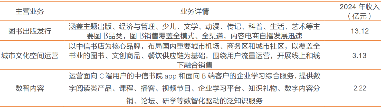 中信出版成立于 1988 年,隶属于中国中信集团有限公司,拥有图书、报刊、电子、音像和网络出版及批发零售全牌照,是国内首批一级出版社和全国百佳图书出版单位。业务结构看,目前公司主营 1)图书出版与发行:核心主业,25H1 收入占比~79%,涵盖主题出版、经管、少儿、文学、动漫等主要图书品类;2)数智服务:25H1 收入占比~12%,运营面向 C 端用户的中信书院 APP 和面向 B 端客户的企业学习综合服务,提供数字阅读类产品等数智化驱动的泛知识服务;3)城市文化空间运营:25H1 收入占比~19%,以中信书店为核心品牌,布局国内重要城市机场、商务区和城市社区,以覆盖全书业的图书、文创商品、餐饮供应链为基础,围绕用户流量运营,开展线上和线下融合销售。