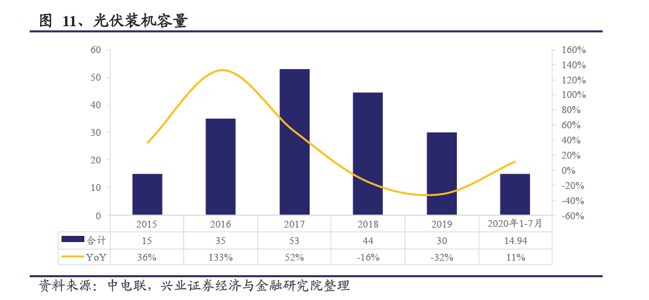 2020 年1-7 月全国光伏新增装机14.94 GW,同比提升11%。国内政策落地,海外需求景气,龙头集中度提升,技术进步成本下降驱动需求。