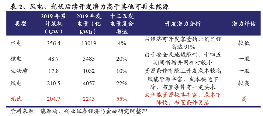 2、光伏开发潜力优于其他可再生能源,光伏装机量未来或较快增长