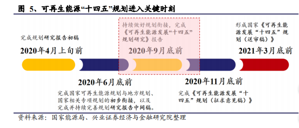 根据计划,今年9月底前应完成《可再生能源发展“十四五”规划研究》报告,11月底前形成《可再生能源发展“十四五”规划(征求意见稿)》,2021年3月底前需形成国家《可再生能源发展“十四五”规划(送审稿)》。