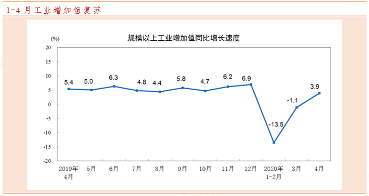 事实概述:2020年05月13日,国家统计局发布数据显示,4月CPI同比增长3.3%,环比下降0.9%,分别较上月下降-1和2个百分点;核心CPI同环比分别增长1.1%和0.0%,分别较上月变动-0.1和0.2个百分点;4月PPI同比增幅降至-3.1%,环比上升至1.3%;5月15日,国家统计局发布数据显示,4月工业增加值同比上涨3.9%,前值下降1.1%,环比增长2.27%;消费方面4月社会零售消费总额下降7.5%,不及预期-7%;投资方面4月固定资产投资同比下滑10.3%,较前值收缩5.5个百分点;就业方面,4月城镇调查失业率为6%,较前值上升0.1个百分点。同日,央行开展1000亿MLF操作,中标利率维持2.95不变。
