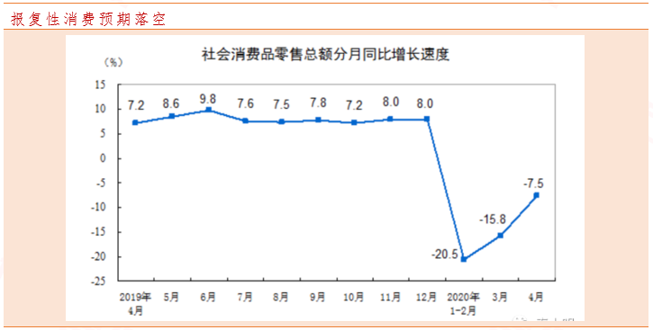“报复性消费”预期落空。从环比看,消费在疫情控制后逐月改善,但改善的速度远远低于市场预期。尤其是4月,是一个完整的疫情全面控制复工复产全面推进的月份,但消费增速却低于市场预期0.5个百分点。由于4月复工复产已经推进,影响居民消费的因素已经由疫情初期的外省冲击变为居民对未来收入预期的下降。本月就业数据中调查失业率的增加也印证了这一点。